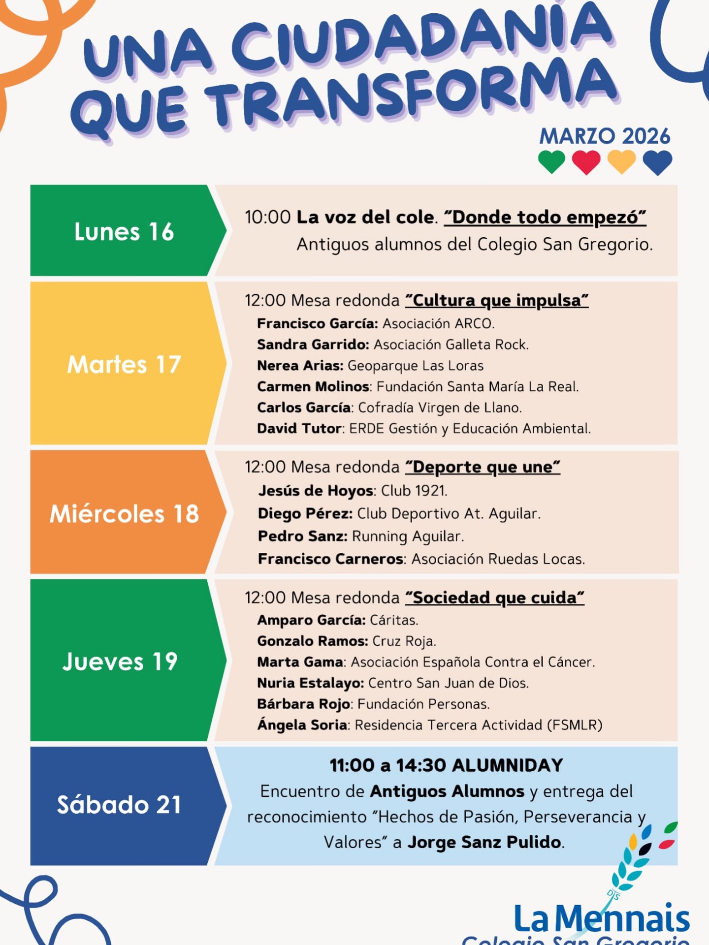 Fecha: del 16 al 21 de marzo Lugar: Colegio San Gregorio Programa: ver archivos adjuntos