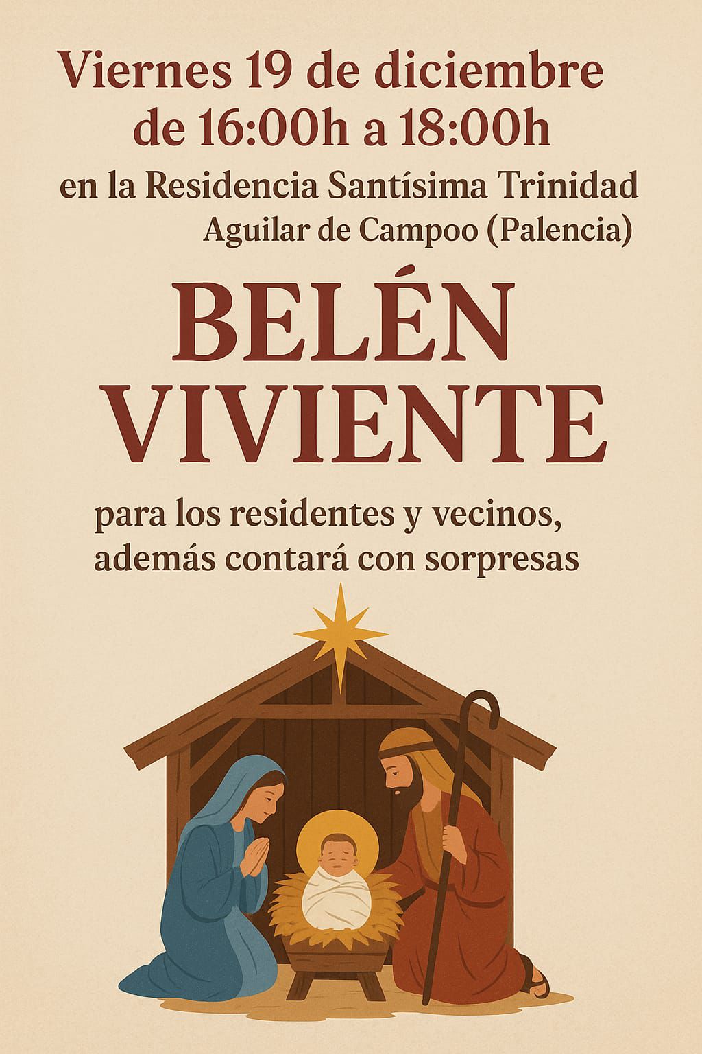 Belén viviente. Fecha: viernes 19 de diciembre Hora: de 16.00 h a 18.00 h Lugar: Residencia Santísima Trinidad Localidad: Aguilar de Campoo