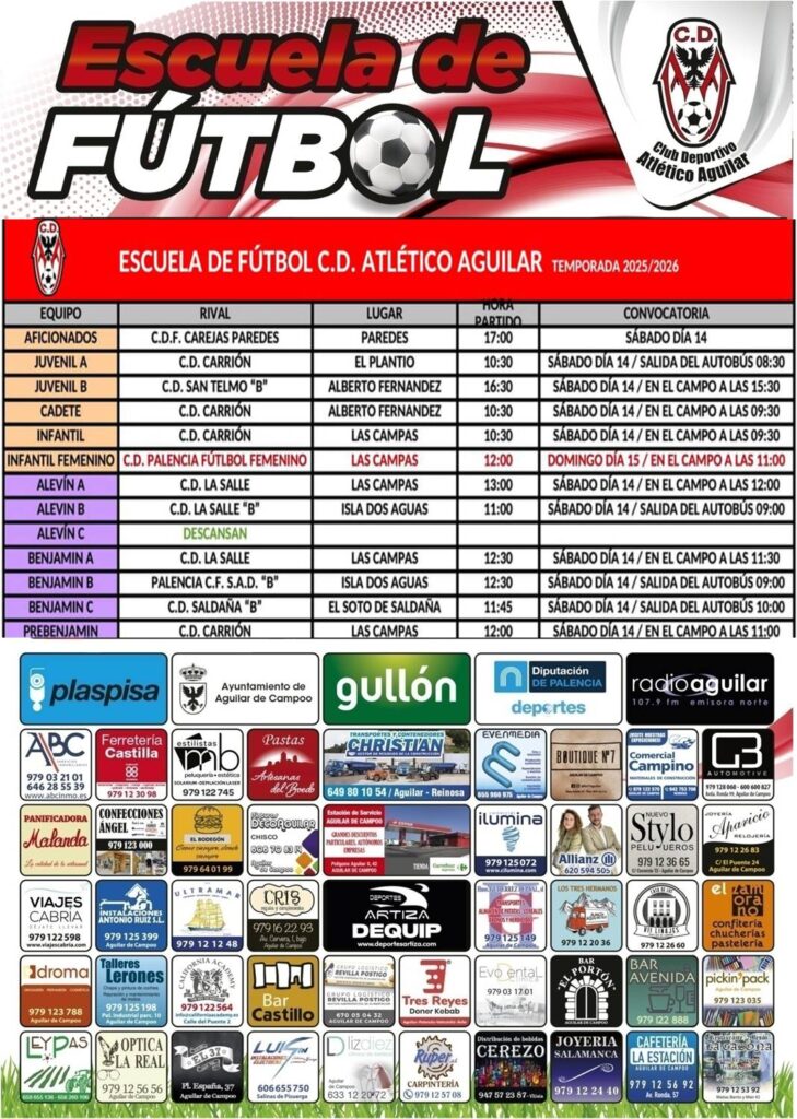 Conocemos en el siguiente espacio las noticias relacionadas con la escuela de fútbol del Club Deportivo Atlético Aguilar. El presidente de la entidad, Diego Pérez nos cuenta los resultados de los últimos partidos que han disputado los equipos el pasado fin de semana, destacando las nueve victorias, dos derrotas y un empate. Además, nos avanza los horarios de los encuentros que se van a jugar este próximo fin de semana, en el que se jugarán siete partidos en Aguilar de Campoo.