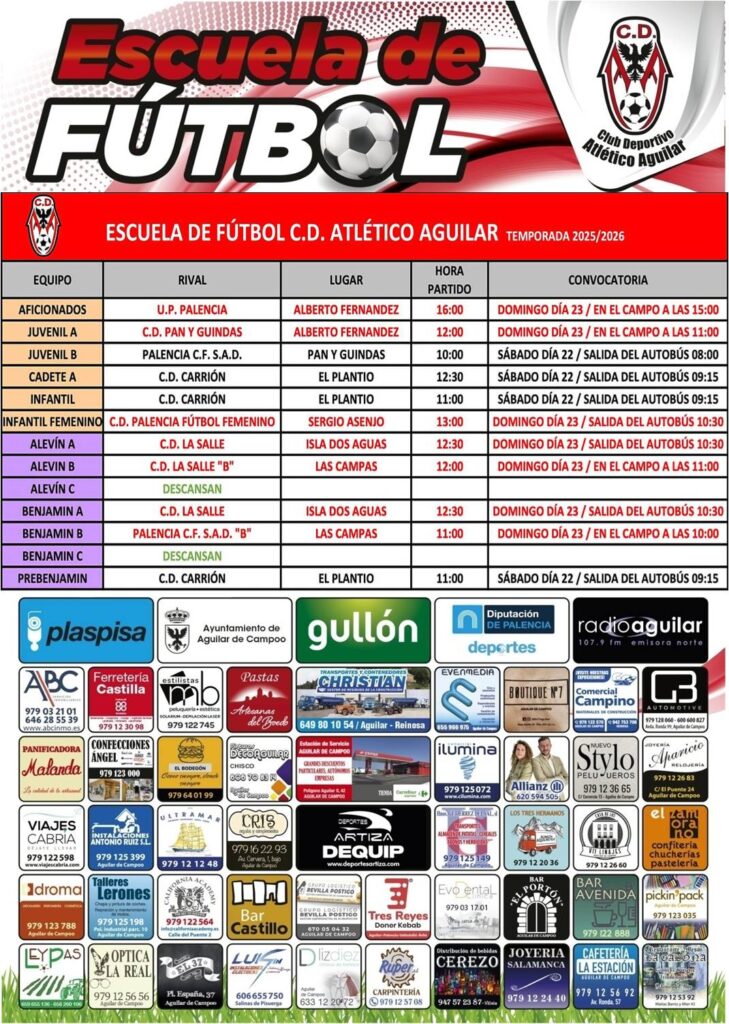 Conocemos en el siguiente espacio las noticias relacionadas con la escuela de fútbol del Club Deportivo Atlético Aguilar. El presidente de la entidad, Diego Pérez nos cuenta cuáles han sido los resultados de los últimos partidos disputados en la última jornada en la que se tuvieron que aplazar tres encuentros por el mal estado de los campos y la lluvia; así como los horarios de los encuentros que se juegan este fin de semana.
