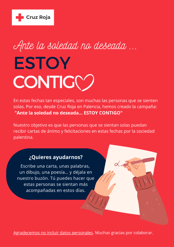 “Nadie debería sentirse solo en estas fechas, cada carta, cada palabra y cada gesto cuenta. Con tu colaboración, podemos transformar la soledad en compañía y la distancia en cercanía. Súmate a esta cadena de esperanza y ayuda a que estas fiestas sean más cálidas para quienes más lo necesitan. ¡Entre todos y todas, podemos hacer que Palencia abrace con fuerza a quienes esperan un mensaje de ánimo!” Concluye la presidenta provincial de Cruz Roja en Palencia, Ana Mª Pérez del Rio.
